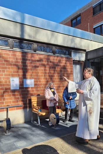 Wiesbaden, den 19.03.2025. Bewegung und soziale Kontakte sind gleichermaßen wichtig für die Gesundheit im Alter. Die neu installierte "Plauderbank" an der Kirche St. Hedwig in Wiesbaden-Biebrich ermöglicht beides: Mit dem eingebauten Radtrainer trainieren Nutzer:innen der Bank schonend ihre Rücken- und Beinmuskulatur und können sich dabei entspannt mit dem/der Sitznachbar:in unterhalten. Eine Spende der Kuraray Europe GmbH aus Hattersheim hat die Anschaffung ermöglicht, ehrenamtliche Helfer haben die Bank vor der Kirche St. Hedwig unter dem Motto "St.Hedwig macht mobil" aufgebaut.