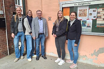 Fliesenanbringung an der Bergkirchengemeinde (v. l. n. r.): Alexander Trauten (Sozialarbeiter RD WIRT), Nicole Nestler (Fachstelle Gesellschaftliche Verantwortung, Evangelisches Dekanat Wiesbaden), Pfarrer Markus Nett (Bergkirchengemeinde), Kim Linz (Bereichsleitung Wohnungsnotfallhilfe, RD WIRT) und Susanne Bender-Petrovic (Assistenz Soziale Arbeit/Fundraising, RD WIRT).