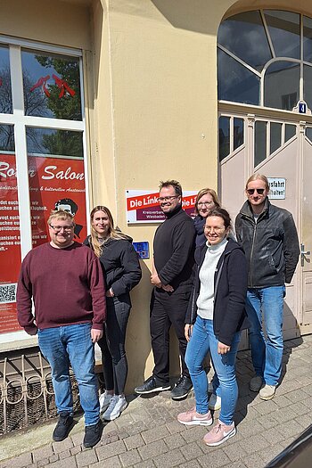 Fliesenenthüllung am Parteibüro der Linken (v.l.n.r.): Ingo von Seemen (Stadtfraktionsvorsitzender, Die Linke), Kim Linz (Bereichsleitung Wohnungsnotfallhilfe, RD WIRT), Jona Löbcke (Kreisvorsitzender Die Linke), Nicole Nestler (Fachstelle Gesellschaftliche Verantwortung, Evangelisches Dekanat Wiesbaden), Susanne Bender-Petrovic (Assistenz Soziale Arbeit/Fundraising, RD WIRT) und Alexander Trauten (Sozialarbeiter RD WIRT).