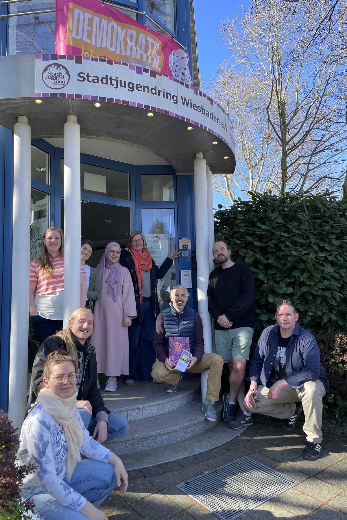 Fliesenanbringung beim Stadtjugendring: Vorne links: Susanne Bender-Petrovic (Assistenz Soziale Arbeit/Fundraising) und Alexander Trauten (Sozialarbeiter), beide RD WIRT; stehend v.l.n.r.: Natascha Leucht, Laura Wirsching und Karima Chaban (alle SJR), Nicole Nestler (Fachstelle Gesellschaftliche Verantwortung, Evangelisches Dekanat Wiesbaden), rechts Rico Petzold (Leiter Jugendnaturzeltplatz, SJR), Richard Hauptmeier (Sozialarbeiter, RD WIRT) und Renke Theilengerdes (Geschäftsleitung, SJR).