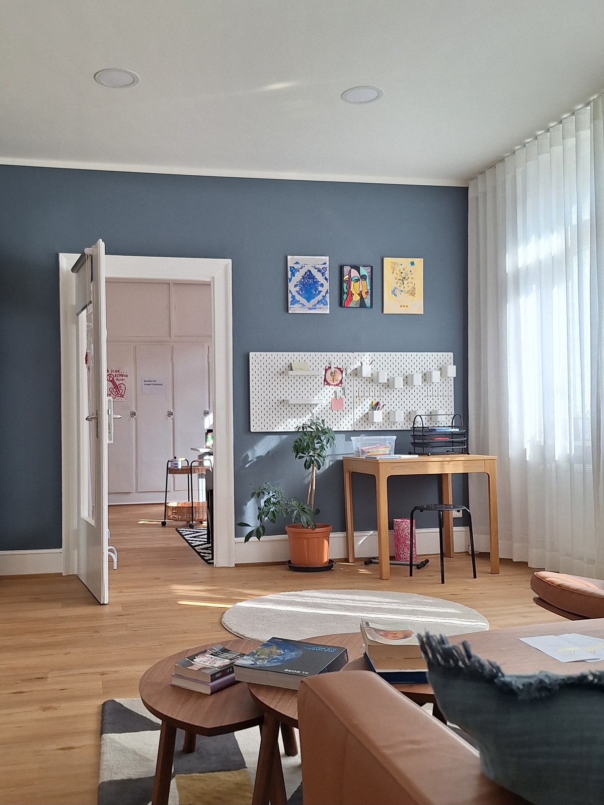 - einen mit großem Tisch und Stühlen ausgestatteten Raum für das FLINTA*-Frühstück (mittwochs von 9:00 bis 10:00 Uhr) oder andere gemeinsame Aktivitäten
