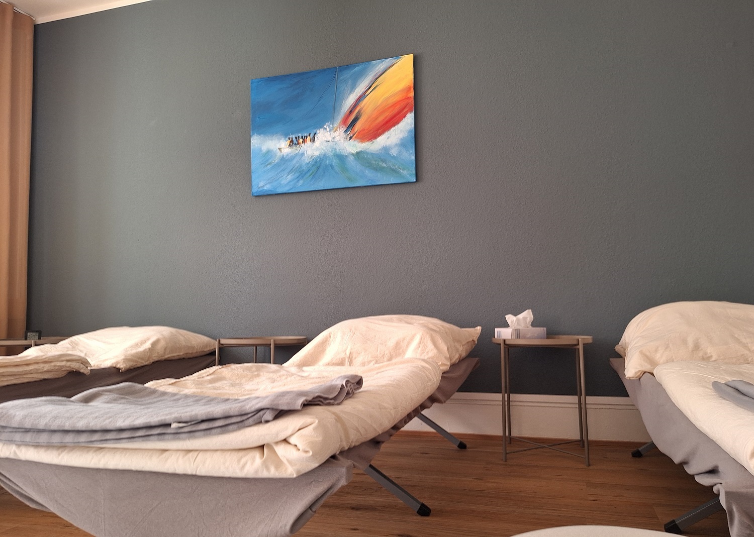 - einen Tagesruheraum, in dem FLINTA*-Personen ohne festen Wohnsitz zur Ruhe kommen und Schlaf nachholen können